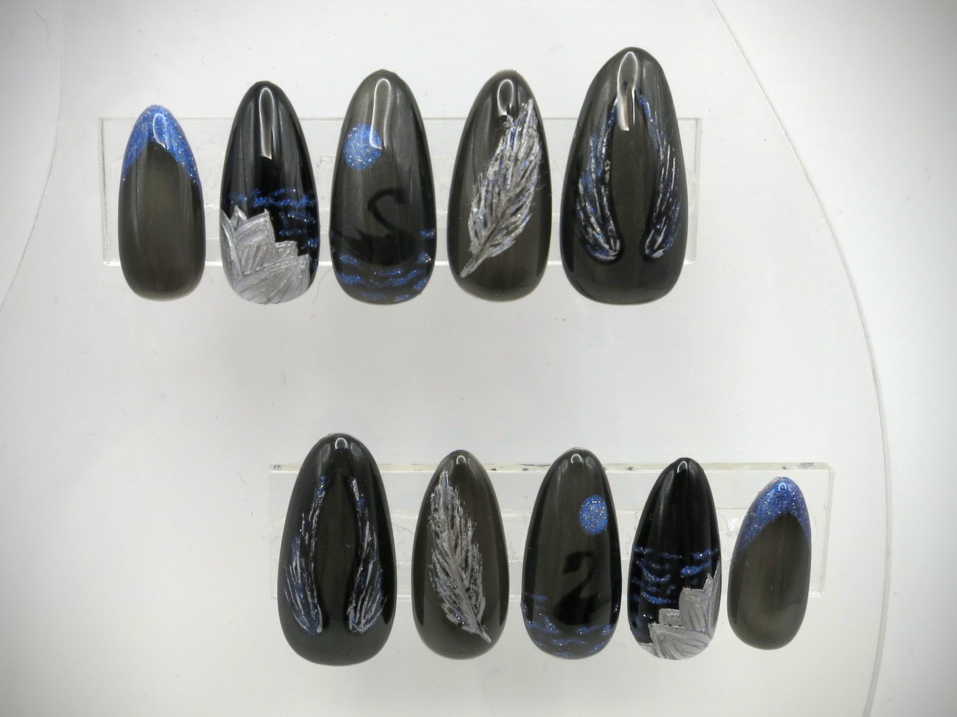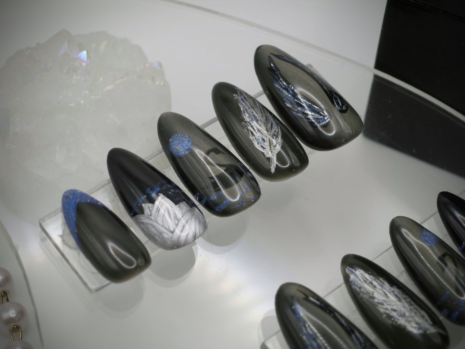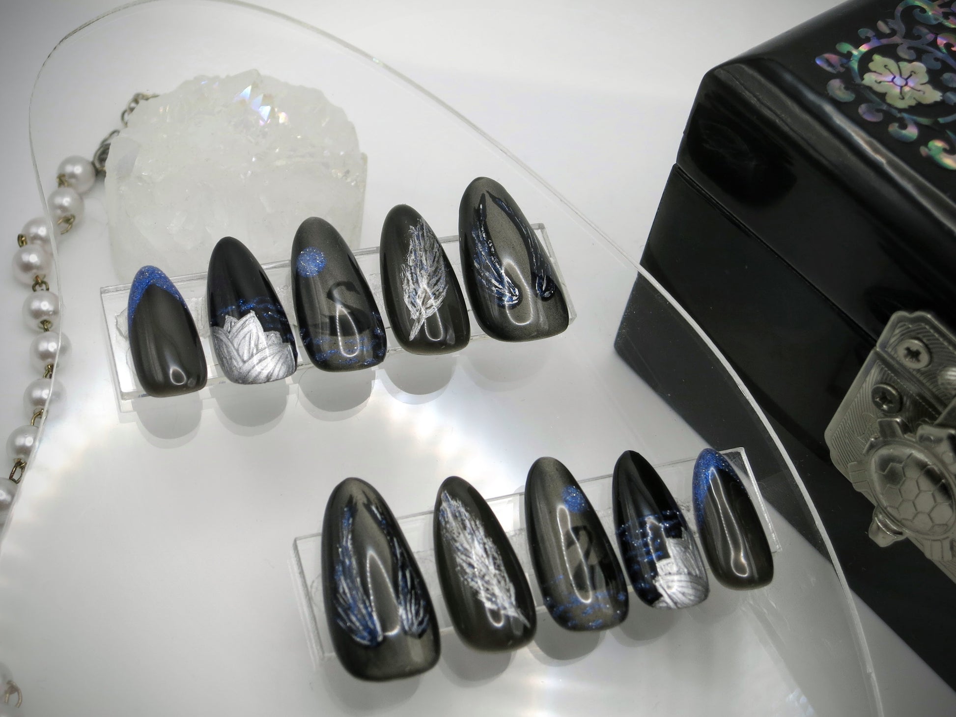 Our Black Swan inspired set pairs moody gunmetal cat eye polish with iridescent blue glitters and hand-painted swans, lotuses, and feathers. Perfect for when you're feeling a little emo, or even if you just want to sit and stare at the cat eye effect flashing back and forth as you move your hand. Make sure to watch the video for this set, as still pictures really don't do it justice!