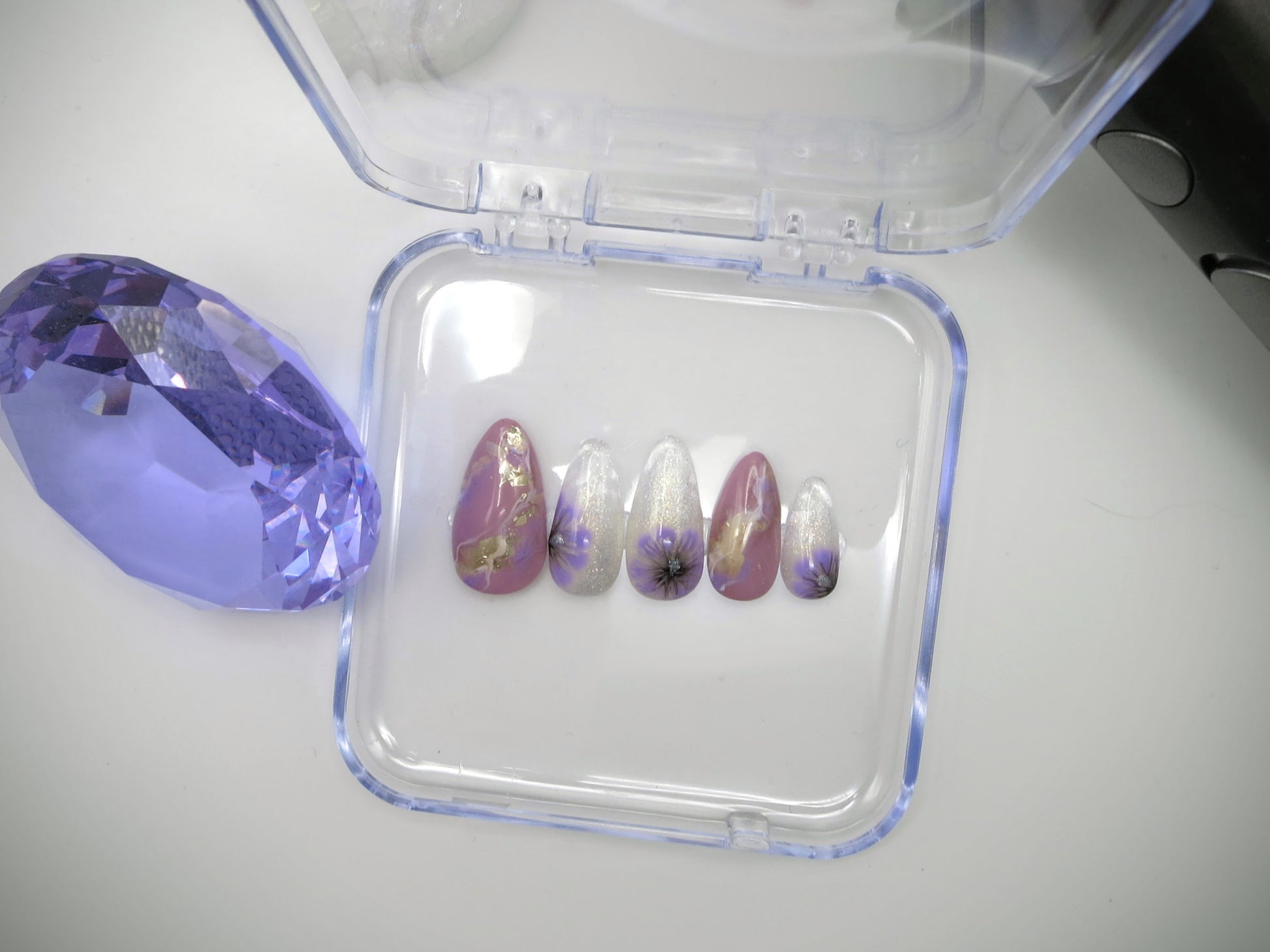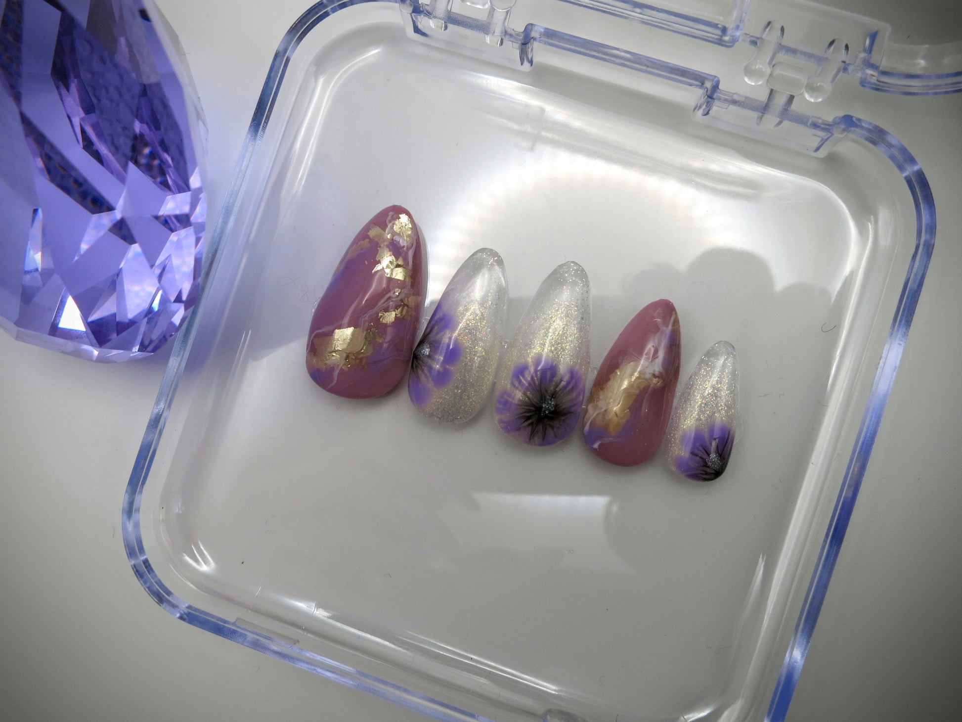 The seventh and final of seven entries to our Arirang Vinyl Series, this set represents our Golden Maknae JK and the color orchid. We have light purple gemstones (that polish color is officially named "I Purple U", by the way...) with golden inclusions, and ethereal golden fairy glitter around purple mugunghwa flowers.